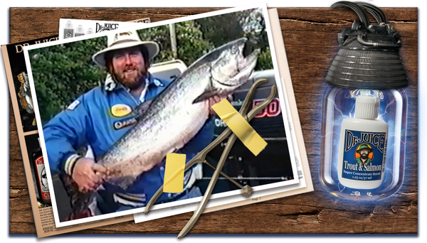 "I was doing research on my Dr. Juice® trout and salmon scent when my Minnesota state record pink salmon hit my salmon colored yarn fly. The DNR told me it might be a line class world record fish. Problem is the IGFA disqualifies fish if you use scent on your fly. What? Dr. Juice® with no scent on his fly? I think they determined scent is too effective. Do they think it’s cheating?"